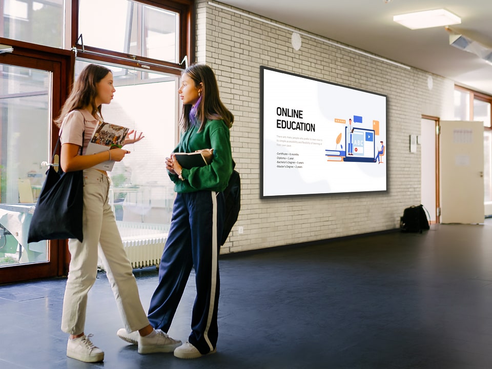 - Crisp 4K UHD resolution guarantees engaging content quality and the versatility to double-up as a meeting room presentation board or robust digital kiosk solution.
